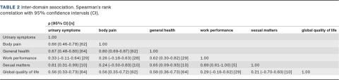 Inter-domain associations are reported in Table 2. Positive, monotonic relationships were demonstrated for body pain, urinary symptoms and general health with Spearman’s correlation coefficients ranging from0.56 to 0.80.