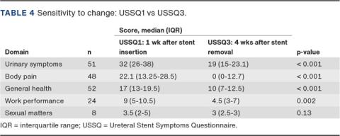 RESULTS. A total of 65 patients (92.9%) completed the USSQ. Statistical evaluation revealed good internal consistency in all domains except work performance. Satisfactory convergent validity (<–0.4 or > 0.4) was demonstrated for urinary symptoms, body pain and global quality of life. The test-retest reliability-coefficient was statistically significant for urinary symptoms, general health, pain and sexual matters. Inter-domain associations were positive and monotone for all subscales. All sub-scores, except sexual matters, significantly decreased from one week after stent insertion to four weeks after stent removal (p < 0.001).
