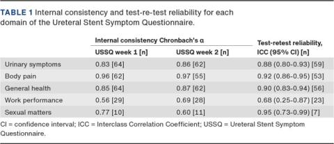 CONCLUSION. The Danish USSQ is a reliable and valid instrument with which to evaluate urinary symptoms and general health in patients with indwelling ureteral stents.