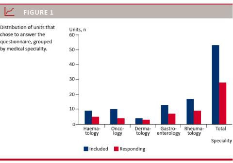 Of the 25 approached but not participating units (47%), four were haematology units (16%), six oncology units (24%), one was a dermatology unit (4%), six were gastroenterology units (24%) and eight were rheumatology units (32%).