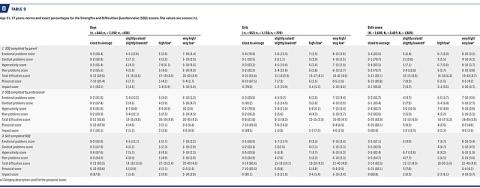 For questionnaires completed by parents and professionals, the thresholds for the total difficulties score are higher for boys than for girls in all three age groups. This gender difference is most pronounced in assessments from professionals and is primarily driven by higher ratings of hyperactivity and conduct problems in boys than in girls. In responses from both parents and professionals, the total difficulties scores are relatively stable across the age groups, although there is some age-related variation in the underlying scores.
