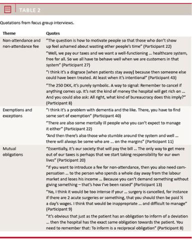 Introduction: Patients’ non-attendance is a significant problem in modern healthcare. Non-attendance delays treatment, reduces efficiency and increases healthcare costs. For several years, the introduction of financial incentives such as a non-attendance fee has been discussed in Denmark. Set in the context of a tax-financed, free-for-all healthcare system, the political hesitance to introduce fees relates to concerns that additional fees may be badly received by tax-paying citizens and may undermine the political priority of patient equity. The aim of this qualitative sub-study was to investigate patients’ attitudes towards a fee for non-attendance.