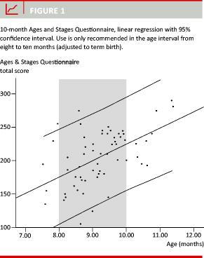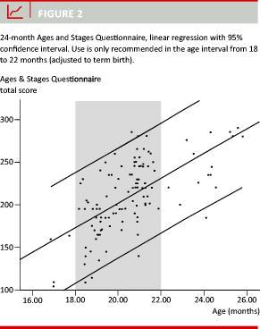 Results: The total scores were normally distributed in both groups. There was a highly significant (p < 0.001) linear regression between ASQ total score and adjusted age for both the 10- and the 24-month ASQ. The regressions can be summarized by the following formulas: #PLACEHOLDER1