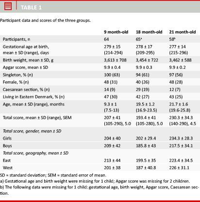 The response rate was 64%, 59% and 66%, respectively, in the three groups of children. Table 1 summarizes data from participants/responders and non-responders. There were no significant differences between non-responders and participants (p > 0.05) concerning birth weight, gestational age and Apgar score, nor between singletons versus twins, females versus males, or children living in Eastern versus Western Denmark. Caesarean section for the 9 month-old children displayed a marginally significant difference between responders and non-responders (Pearson 2 = 0.023), but this is considered a mass-significance effect.