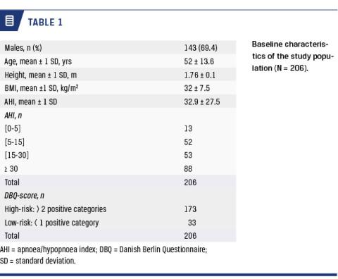 In total, 206 patients completed the DBQ and underwent overnight diagnostic CRM. The characteristics are given in Table 1. A total of 110 (53.3%) patients were obese (BMI > 30) and 135 had hypertension (65.5%).