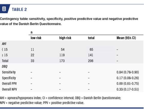 AHI ≥ 15 was present in 141 patients (68%), the total mean AHI of the population was 32.9. DBQ identified 173 of 206 (84%) as having a »high risk« of OSA and 33 (16%) as having a »low risk«. When screening for OSA with AHI ≥ 15 and »high risk« (DBQ ≥ 2 positive categories), the sensitivity was 0.84 (95% confidence interval (CI) 0.78-0.90), and the specificity was 0.17 (95% CI 0.08-0.26) (Table 2).
