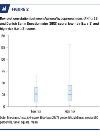 In Figure 2 the figure text has been edited from “Box-plot correlation between AHI ≥ 15 and DBQ-score: low-risk and high-risk” to: “Box-plot correlation between Apnoea/hypopnoea Index (AHI) ≥ 15 and Danish Berlin Questionnaire (DBQ) score: low-risk (i.e. ≤ 1) and high-risk (i.e. ≥ 2) score.”
