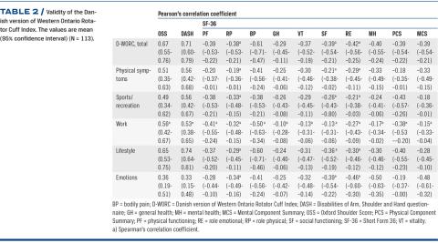 The aim of this study was therefore to translate and adapt the WORC into a Danish version (D-WORC) and to evaluate the validity, reliability and responsiveness of the D-WORC in a cohort of native Danish-speaking patients undergoing surgery for arthroscopic subacromial decompression (ASD) or rotator cuff repair (RCR). We hypothesised that the D-WORC was positively correlated with other shoulder-specific questionnaires (OSS and DASH), but negatively correlated with a generic questionnaire (Medical Outcomes Study Short-Form 36 (SF-36)).