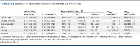 Methods: The original WORC version was cross-culturally adapted into Danish and the validity, test-retest reliability, responsiveness construct validity, internal consistency, interclass correlation coefficient (ICC), limits of agreement (LOA) and an anchor minimal important change (MIC) were assessed using the Disabilities of Arm, Shoulder and Hand (DASH), the Oxford Shoulder Score (OSS), the Short Form-36 and the global rating scale.