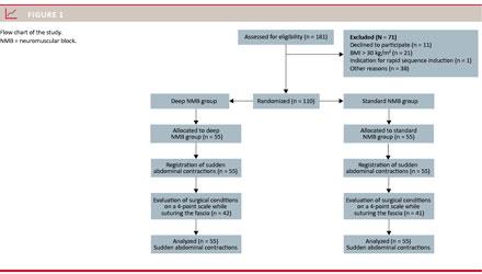 Introduction: Establishment of sufficient muscle relaxation is essential in laparoscopic surgery. During laparoscopy, surgeons can experience abdominal contractions in their patients. Deep neuromuscular block (NMB) has the potential to prevent such episodes. In this study, we explored if deep NMB reduces the incidence of sudden abdominal contractions as compared with standard NMB.