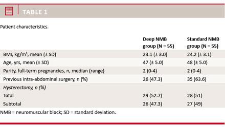 Patients were randomized to either deep NMB and 8 mmHg pneumoperitoneum (deep NMB group) or standard NMB and 12 mmHg pneumoperitoneum (standard NMB group) with stratification for type of hysterectomy (total or subtotal).