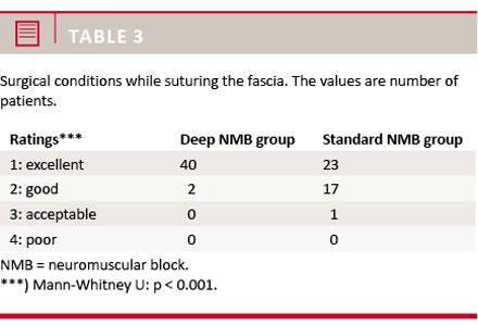 In 83 patients, the abdominal fascia was sutured and surgical conditions were evaluated. Deep NMB significantly improved surgical conditions estimated on a four-point rating scale while suturing the abdominal fascia (p < 0.001) (Table 3). There was no difference in the duration of surgery (65 min in the deep NMB group versus 70 min in the standard NMB group (p = 0.624), respectively [13]. All operations were completed according to allocation, i.e. there was no need to either increase intraabdominal pressure or administer a bolus of muscle relaxant.