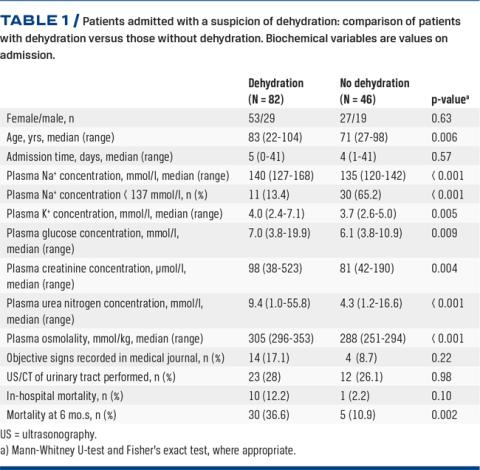 In the inclusion period, 1,727 patients were admitted to the GMA Department, median age 71 years (range: 16-105 years). A total of 128 patients (7.5% of those admitted) were admitted on suspicion of dehydration (80 women and 48 men). The median age of these patients was 81 years (range: 22-104 years). Eighty-two patients (64%) (53 women and 29 men) had dehydration according to the definition. Table 1 compares patients with dehydration to those without for patients admitted on suspicion of dehydration. The dehydrated group had significantly higher levels of sodium, potassium, glucose, creatinine and urea. Also, these patients were older than the non-dehydrated patients.