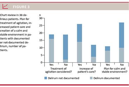 Results: Out of the 118 patients included in the study, 38 (32%) were delirious and in 18 (47%) patients, the diagnosis was documented. Furthermore, in 18 (47%) patients, a pharmacological treatment plan for agitation was prepared (in 89% of those diagnosed with delirium and in 10% of those without the diagnosis). In 26 (68%), a plan to increase care existed (in 78% of those with a diagnosis of delirium and in 60% without the diagnosis). In 11 patients (29%), there was a plan for reducing stress (in 44% of those with