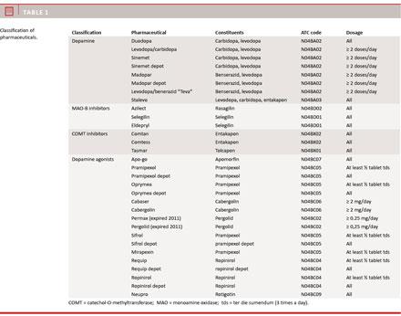 Participants had to be alive at the end of 2010 and to have redeemed a prescription twice or more for one of the medications shown in Table 1 in the 2009-2010 period. Prescriptions required an indication of Parkinson’s disease/Parkinson-related dementia corresponding to indication code 351 or 595. Dopaminergic agents belong to ATC group N04B.
