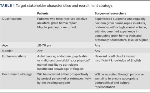 To ensure the relevance, appropriateness and feasibility of the COS, it is imperative that the relevant stakeholders are represented in the Delphi panel. We will include both patients and surgeons/researchers in our Delphi panel, and the target stakeholder characteristics and the recruitment strategy are presented in Table 1. The panel will be divided into two groups: one for patients and one for surgeons/researchers.