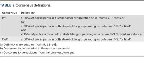 Round I data will be analysed with descriptive statistics, both separately for each stakeholder group and overall. Results will be evaluated according to the consensus definitions listed in Table 2. If an outcome does not meet the consensus criteria, it will be labelled “no consensus”. At the end of Delphi Round I, we will conduct a steering committee meeting to evaluate the results and discuss the additional outcomes proposed by participants. The Steering Committee will decide the contents of the questionnaire for Round II.