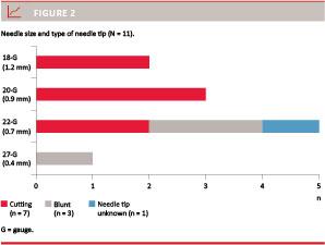 The results of the survey showed that different needle types were preferred. Only three (27%) reported routine use of BN. Five (45%) departments used a large-calibre needle (18-20-G; 1.2-0.9 mm), while the remaining six (55%) used smaller calibre needles, ≥ 22-G (≤ 0.7 mm) (Figure 2). No department reported using a 25-G (0.5 mm) needle.