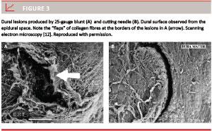 Reina MA, de Leon-Casasola OA, Lopez A et al. An in vitro study of dural lesions produced by 25-gauge Quincke and Whitacre needles evaluated by scanning electron microscopy. Reg Anesth Pain Med 2000;25:393-402.