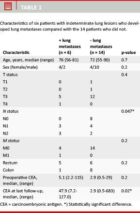 Table 1 shows the characteristics of the patients with indeterminate lesions who developed CRC lung metastases compared with those who did not. All the former patients had nodal metastases at operation (N1 or N2 status) and significantly increased CEA levels at the latest follow-up visit. Only one of the patients had synchronous liver metastases at primary staging (17%, 95% confidence limits: 1-64).