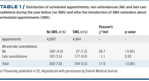 Non-attendances and late cancellations of appointments may disturb the management of outpatient clinics and are associated with unnecessary healthcare costs [1-3]. Recently, considerable focus has been given to improving non-attendance rates by sending out electronic reminders to patients. A systematic review identified 11 studies that used SMS reminders [4]. All studies found a statistically significant improvement in non-attendance rates. Ten of the studies were conducted in adult patient populations, only one in children. A tertiary general paediatric referral centre intervention study found that the mean non-attendance rate improved by approx. 40% [5]. The potential effect of SMS text reminders on the rate of late cancellations, however, was not assessed. To the best of our knowledge, data on SMS text reminders in secondary paediatric settings have yet to be published. The aim of the present study was to assess if SMS text messaging reminders affect non-attendance and late cancellation rates in children in a secondary paediatric outpatient centre.