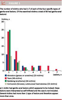 A total of 86 victims reported exposure to other sexual actions than penile penetration. In 36 cases, there was no information in the papers on any penetration. In all, 14 of these victims had genito-anal lesions, whereas 22 had none.
