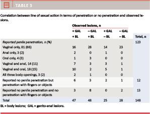 Table 3 shows the correlation between the line of sexual action in terms of sexual activity during the rape, specifically whether penetration occurred or not and if any lesions were observed.