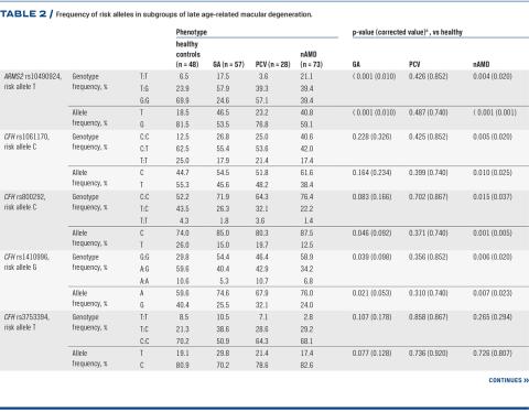 Compared with healthy controls, patients with neovascular AMD had a higher frequency of the risk allele rs10490924-T in ARMS2, CFH (rs1061170, rs800292, rs1410996) and C2 rs9332739 (Table 2).