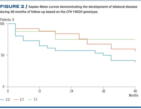 Furthermore, we found that patients with development of bilateral neovascular AMD had a significantly higher frequency of the risk allele in CFH rs1061170 than patients with persistent unilateral disease (p = 0.036, Fisher’s exact test) (Figure 1). Additionally, we created Kaplan-Meier curves for each genotype showing the rate of development of bilateral disease over time (Figure 2). The difference in rate was different for the various genotype groups (χ2 = 3.786; p = 0.05, log-rank test).