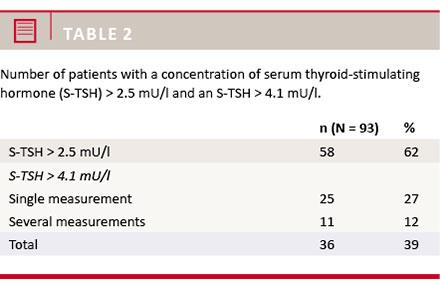 The number of patients who had an S-TSH above 4.1 mU/l measured (min. 4.1 and max. 35.0 mU/l) during the pregnancy was 36 (see Table 2). However, in 25 patients only one measurement with a slight increase in S-TSH was present. If the cut-off was lowered to 2.5 mU/l, the number increased to 58 pregnant women with a minimum of one measurement of elevated S-TSH (including patients with an S-TSH exceeding 4.1 mU/l). If the women who were referred to the clinic with hypothyroidism during pregnancy were excluded, the number of patients who had an S-TSH over 2.5 mU/l was 48, and 26 had an S-TSH above 4.1 mU/l (median 6.1, range 4.1-35.0). Only 11 women had several measurements of S-TSH over 4.1 mU/l, five of these had poor compliance despite increased care, and five were not monitored in the clinic before their pregnancy.