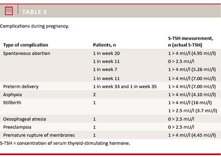 Hypothyroidism in young women is usually caused by autoimmune thyroiditis [8]. The condition is associated with a decrease in fertility, and an association between maternal hypothyroidism and pregnancy complications [9-11], as well as impairment of the neuropsychological function of the child [12, 13]. It was previously found that pregnant women in L-T4 replacement therapy, whose S-TSH values were abnormal when first tested, had a tendency towards increased foetal loss [14]. In an open-label study of hypothyroid patients, miscarriages were found in nine of 31 (29%) of patients with an S-TSH above 4.0 mU/l compared with two of 32 (6%) with an initial S-TSH below 4.0 mU/l [14]. Another new study of 1,013 pregnant L-T4-treated hypothyroid patients [15] showed an increased risk of miscarriage in women with an S-TSH of 4.51-10 mU/l with an odds ratio of 1.8 (95% confidence interval: 1.03-3.14), but no significant risk in patients with an S-TSH between 2.51 and 4.5 mU/l [15]. In our study, we found a similar non-significant trend towards an increased risk of miscarriage in patients with an S-TSH exceeding 4.1 mU/l. However, our study was too small for sufficient evaluation of the pregnancy complications, and the definition of those complications was broad.