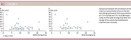 The foetus is entirely dependent on maternal thyroid hormones for its development until about 13 weeks of gestation, and it is important to ensure an adequate thyroxine substitution in pregnant women very early in the pregnancy [5]. Therefore, during pregnancy, an increased daily substitutive dosage of levothyroxine (L-T4) is required in hypothyroid patients in order to meet the maternal needs and secure a normal foetal development [6]. The increase of the L-T4 dosage is usually 30% in the first trimester, and there is an average increase of 48% by 16-20 weeks [7].