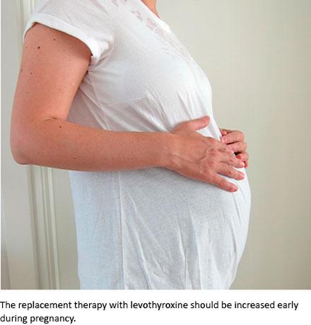 The replacement therapy with levothyroxine should be increased early during pregnancy.
