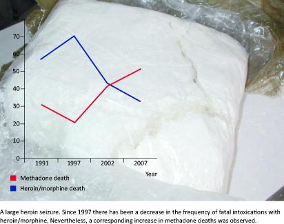 Since 1997, there has been a decrease in the frequency of fatal intoxications with heroin/morphine; yet, there is a corresponding increase in methadone deaths. The increase in methadone deaths indicates that the number of opiate abusers has not changed significantly and that methadone is now used. This is supported by the finding that one third of the methadone-intoxicated drug addicts were receiving methadone treatment. This increase in methadone use was observed in all parts of the country, but most markedly in the area covered by the institute of Odense. Deaths from the central stimulants amphetamine and cocaine occurred infrequently in earlier studies, but are now significant causes of death. It is primarily people younger than 30 years who die from central stimulants; while older drug addicts more frequently die from opioids, especially heroin/morphine and methadone. This trend has also been observed in the treatment system; young abusers increasingly apply for help in connection with abuse of central stimulants, while older drug abusers are more frequently seen in methadone treatment programs [13]. The number of abusers in methadone treatment has more than doubled since 1995. In 2004, 5,700 opiate abusers were in methadone treatment [13]. In the same period, the increase in methadone deaths was immense. The average age of the fatally intoxicated drug addicts in Denmark is higher than that seen in other Nordic countries, which may indicate that methadone treatment has a positive net effect [6]. This is supported by the decrease in fatal intoxications in the capital area where a relatively high recorded proportion (40%) of drug addicts treated with methadone are living. Deaths from buprenorphine were practically absent although 600 opiate abusers were in substitution treatment with buprenorphine in 2004 [13], which suggests that buprenorphine should be considered for substitution treatments.