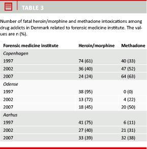 According to the available information, 44 of the drug addicts (19%) were in methadone treatment at the time of death; while in earlier studies, 17-23% were receiving methadone treatment [3-5]. These figures are minimum numbers because information about methadone treatment was not available for all deaths. About one third of the drug addicts who died of fatal methadone intoxication were reported to be in methadone treatment. Heroin/morphine intoxication was the main cause of death in 33% of the cases. This is a marked decrease compared with earlier studies in 1991 (57%), 1997 (71%) and 2002 (44%) (Table 2). In the same period, the frequency of methadone intoxications increased from 31% in 1991 and 21% in 1997 to 51% in 2007 (Table 2). Thus, methadone was the most frequent cause of death in 2007. This trend was observed in all parts of Denmark (Table 3), especially in the area covered by the institute of Odense. However, the frequency of methadone deaths was highest in the areas covered by the institute of Copenhagen, of which half appeared in the Capital, i.e. Frederiksberg and Copenhagen municipalities (50%). In other parts of Denmark, there was a more equal distribution between deaths caused by heroin/morphine and methadone (Table 3).