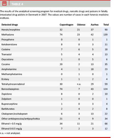 Material and methods: All drug-related deaths examined at the three forensic medicine institutes in Denmark in 2007 were evaluated.