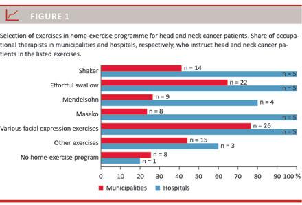 The questionnaires were designed to specifically target the above-mentioned groups. Hence the survey was based on three different questionnaires – one for municipality OTs, one for hospital OTs, one for doctors – which included ten, ten and six questions, respectively, covering areas such as frequency of HNC patients with dysphagia; indication for rehabilitation and referrals hereto; type, duration and intensity of therapy; and professional skills, qualifications and knowledge.