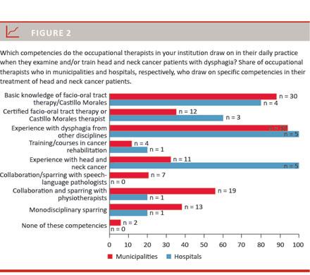 This process yielded a total of 53 questionnaires (39 RC-based OTs; five hospital-based OTs; nine oncologists and four oto-rhino-laryngologists. In general for both RCs and hospitals, 1-3 OTs undertook the task of HNC rehabilitation per workplace. It is not known on behalf of how many oncologists and surgeons the responding doctors gave their answers in their respective departments.