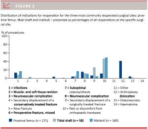The four most common anatomical locations for reoperations were the proximal femur (30%), the distal radius (6%), the tibial shaft (6%) and the malleoli (19%). The recorded indications for reoperation of the proximal femur, the tibial shaft and the malleoli fractures are summarised in Figure 2. Pain and discomfort from orthopaedic hardware, infection and failure of osteosynthesis were the three most common indications for reoperation and accounted for 34%, 14% and 13%, respectively.
