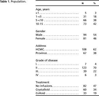 The population consisted of children admitted to the Dengue Hemorrhagic Fever Department in Children's Hospital No 1, Ho Chi Minh City, with the diagnosis DHF in the period from August 25. 2005 to November 3, 2005. The patients were not randomized for the study, but were chosen at random without previous knowledge of the economical status of the family.