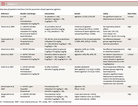 The use of sevoflurane, a volatile anaesthetic, in paediatric anaesthesia is frequent since it is unnecessary to establish an intravenous (IV) access prior to initiation of anaesthesia. This is a clear benefit for children as a needle procedure can be painful and traumatising. Various pharmacological interventions have been investigated for the intervention against post-operative agitation (PA) in children anesthetised with sevoflurane, including clonidine. Clonidine is used off-label for a number of indications in children, including treatment of shivering, pain management and prevention of withdrawal symptoms following too long-term sedation, and PA.