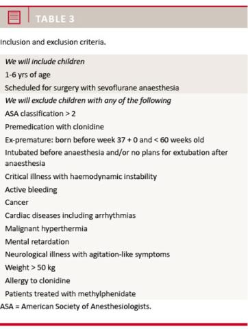 In 2002, the use of clonidine, an alpha-2 receptor agonist, was proposed as a potential prophylactic intervention against sevoflurane-induced PA in children [1]. Several trials have since been published, examining the role of different strategies for clonidine administration and dosing in the perioperative setting (Table 1). Presently, paediatric trials have found few safety issues, no serious adverse effects or significant decrease in blood pressure or heart rate (Table 1 and Table 2) However, current knowledge about pharmacokinetics of clonidine and the relationship between plasma concentrations, safety and effect on PA and pain in children remains limited [2-4].