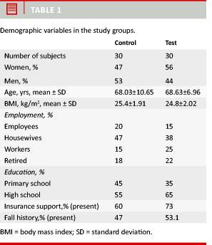 None of the subjects had any experience in exercise programs but were physically active and able to perform activities of daily living independently [8]. Exclusion criteria were: neurological disorder (paresis, stroke, Parkinson’s disease), acute heart impairment (hypertension, congestive heart failure), unstable chronic illness (diabetes mellitus, malignancies), severe musculo-skeletal impairment (inability to participate in the programs) [8]. Ethics approval was obtained from the university’s medical research ethics committee. All subjects agreed to participate by providing written informed consent. The test group was taken into a 12-week aerobic exercise program. The exercises included a 5-10 minute circulatory warm-up, a 15 minute walking, and a 5-10 minute stretching/cool-down period. The exercises were performed three times per week at the rehabilitation unit under supervision of an experienced instructor. No exercise program was prescribed for the control group. Both groups were assessed before and after the exercise program. The same questionnaire was used for the subjects in both groups.