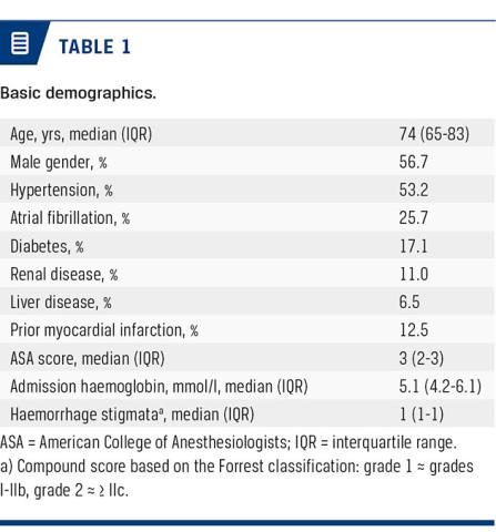 A total of 3,537 patients with treatment-requiring acute NVUGIB were included. Basic demographics are presented in Table 1.