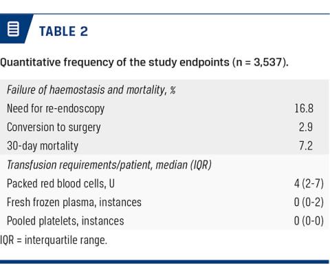 The quantitative frequencies of the study endpoints are shown in Table 2. Re-bleeding occurred in 20% of cases, resulting in either ReWHI (16.8%) or conversion to surgery (2.9%). RPCs were frequent with a median use of four (2-7) units per patient. Fresh frozen plasma (FFP) and pooled platelets (PLT) were rarely employed with a median use of zero instances and an interquartile use of (0-2) and (0-0), respectively.