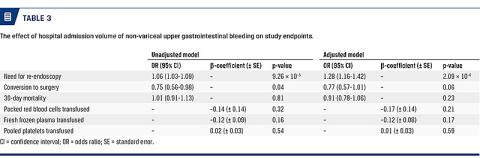 RESULTS: A total of 3,537 patients with acute non-variceal upper gastrointestinal bleeding were included in the study. The hospital admission volume of patients with NVUGIB was positively associated with a significant increase in ReWHI with an odds ratio of 1.27; p = 1.91 × 10–6. There was no significant association between admission volume and conversion to surgery, 30-day mortality or transfusion rates.
