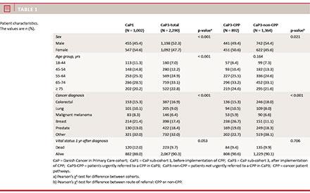 In total, 3,292 patients were included in the analyses; 2,290 of the patients were included after CPP implementation (CaP3) and 892 of these patients were CPP-referred (Table 1). The distribution of sex, age groups and cancer diagnoses differed statistically significantly between CaP1 and CaP3. The distribution of sex and cancer diagnoses differed statistically significantly according to referral route (CPP or non-CPP) (Table 1).