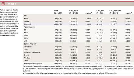 Introduction: Standardised cancer patient pathways (CPPs) were implemented in Denmark in 2008 to reduce the waiting time during the diagnostic process and hereby improve patient satisfaction. The aim of this study was to investigate whether patient-reported dissatisfaction with long waiting times has changed from “before” to “after” the implementation of CPPs.