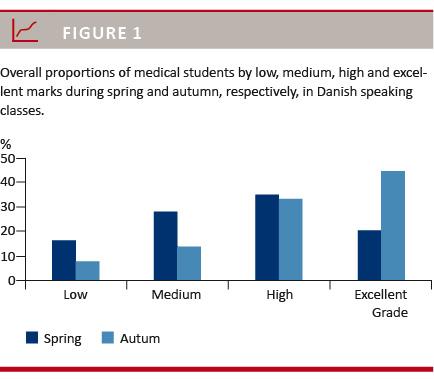 Results: The grading scores were significantly higher among students who were aware of being evaluated with the seven-point grading scores compared with the pass/fail group (p < 0.0001). In comparison, no significant difference between the exam results was observed from the spring- to the autumn semester for the control group (p = 0.45). Moreover, the average mark was higher among the international students (mean = 10.3, on the seven-point grading scale) than in the Danish speaking classes (mean = 9.1).