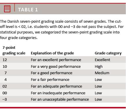 The study intervention consisted of adding a seven-point grading scale to the assessment, single-blinded to the examinees of the Danish speaking classes during the spring semester thereby providing data that allow for comparisons between the grades achieved using the two systems.